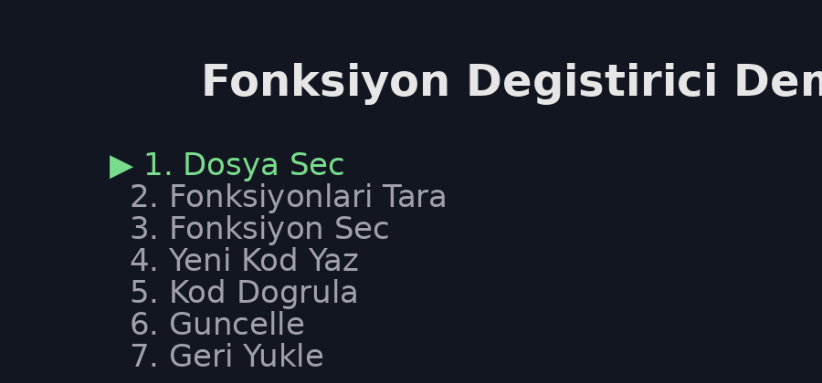 Fonksiyon Değiştirici, Python dosyaları içerisindeki fonksiyonları analiz eden ve güvenli şekilde güncelleyebilen modüler bir geliştirme aracıdır.